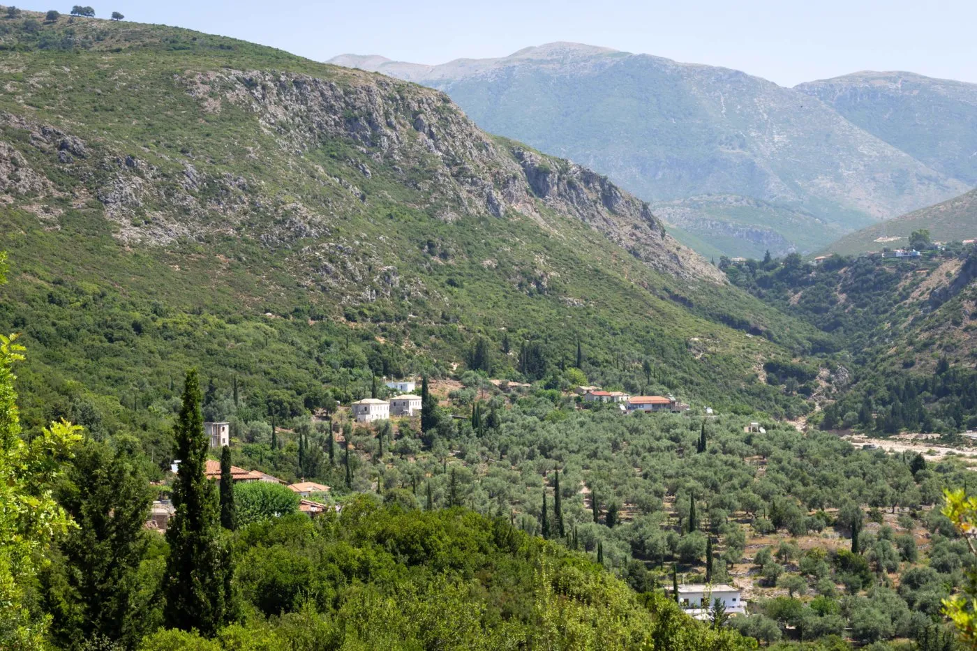 Long white-pebble beach backed by olive groves and a hilltop stone village.
