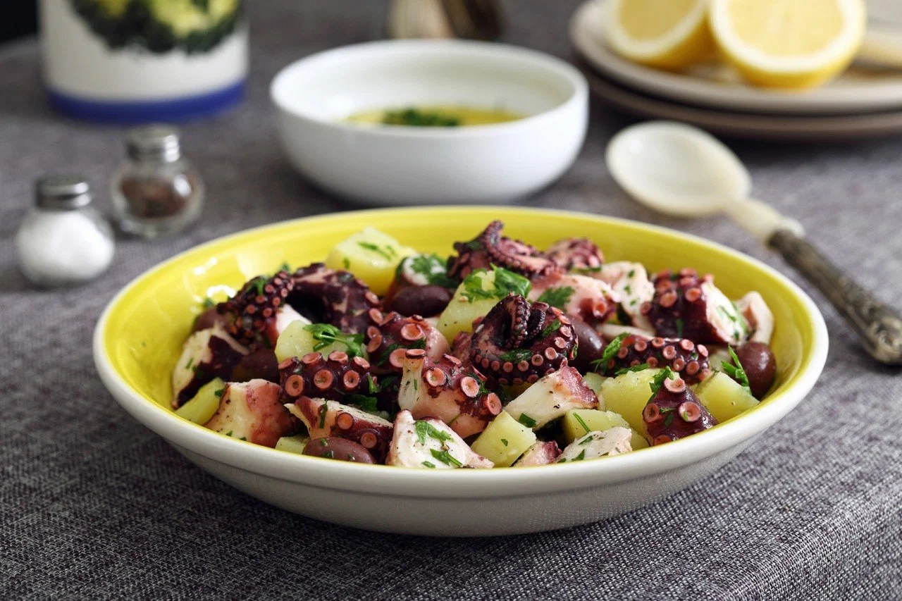 Grilled octopus is a Riviera speciality. Tenderised and charred over hot coals, served with a drizzle of local olive oil and a squeeze of lemon. Some restaurants also serve it in a cold salad with peppers and onions — the perfect light lunch between swims.