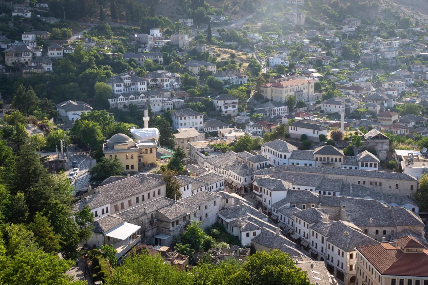 The residential hillside below the castle where hundreds of distinctive stone tower houses create the dramatic skyline that earned Gjirokastër its UNESCO inscription. Many are being restored as boutique guesthouses.