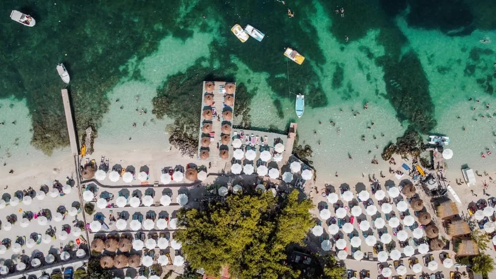 The main strip of white sand facing the three islands. Crystal-clear shallow water perfect for families, with beach bars and loungers available along the shore. The classic Ksamil view — and the image that made Albania famous on Instagram.