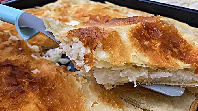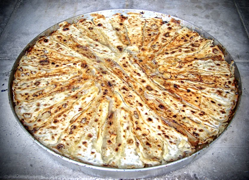 A traditional layered pancake dish made by pouring batter over a hot circular pan (saç) and building up dozens of paper-thin layers. Each layer is brushed with cream or butter before the next is added. The result is a rich, flaky, ceremonial dish served at celebrations and family gatherings.